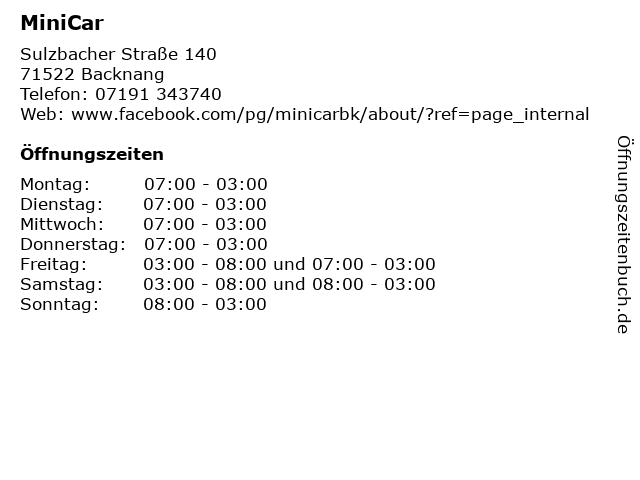 | Öffnungszeiten MiniCar in Backnang anzeigen | |