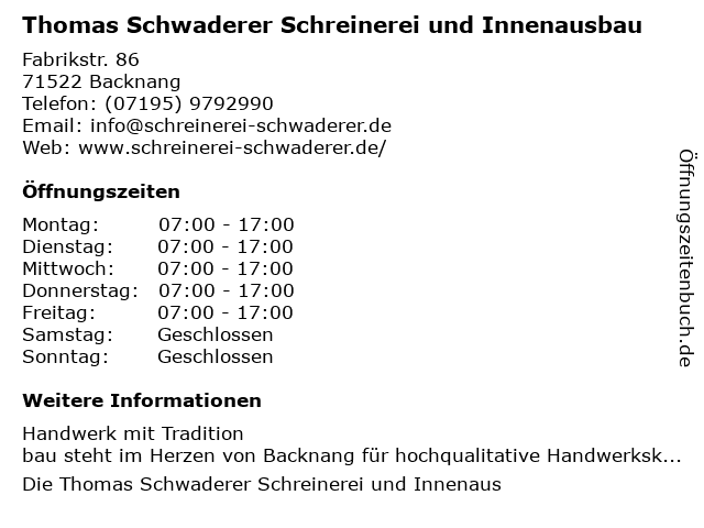 1 Thomas Schwaderer Schreinerei und Innenausbau (Entfernung: 5,76 km) Eichendorffstraße 5, 71397 Leutenbach 6 |