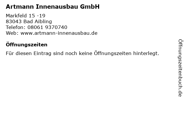 | Öffnungszeiten Artmann Innenausbau GmbH in Bad Aibling anzeigen | |