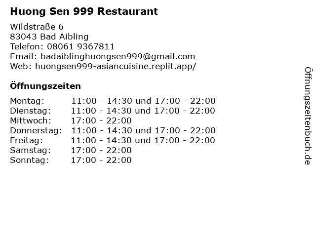 | Öffnungszeiten Huong Sen 999 Restaurant in Bad Aibling anzeigen | |