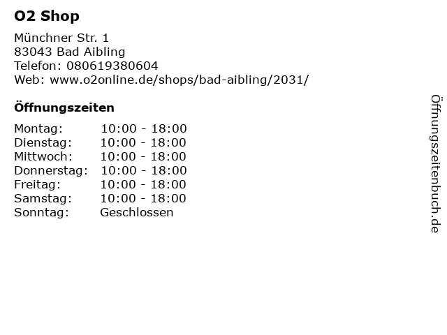 | Öffnungszeiten O2 Shop in Bad Aibling anzeigen | |