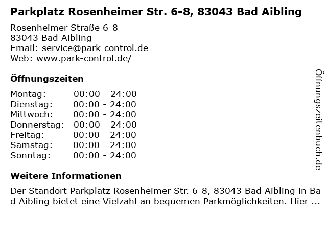 | Öffnungszeiten Parkplatz Rosenheimer Str. 6-8, 83043 Bad Aibling in Bad Aibling anzeigen | |