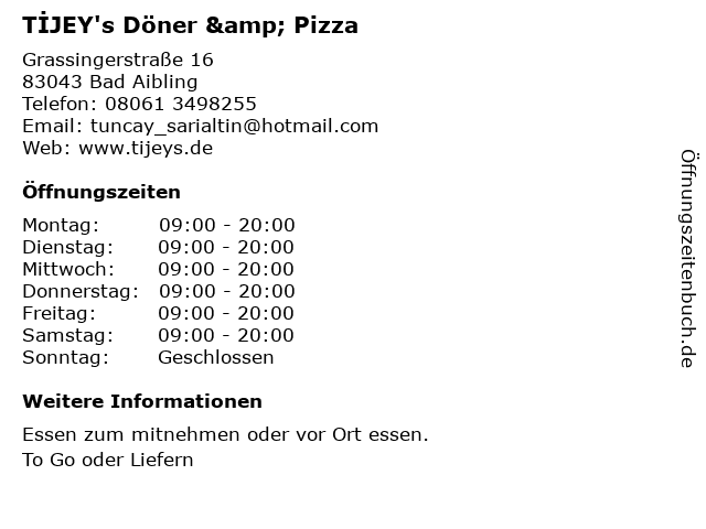 | Öffnungszeiten TİJEY's Döner & Pizza in Bad Aibling anzeigen | |