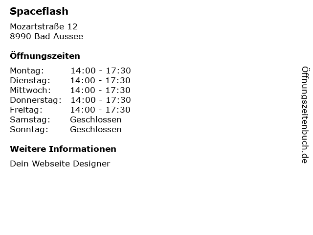 | Öffnungszeiten Spaceflash in Bad Aussee anzeigen | |