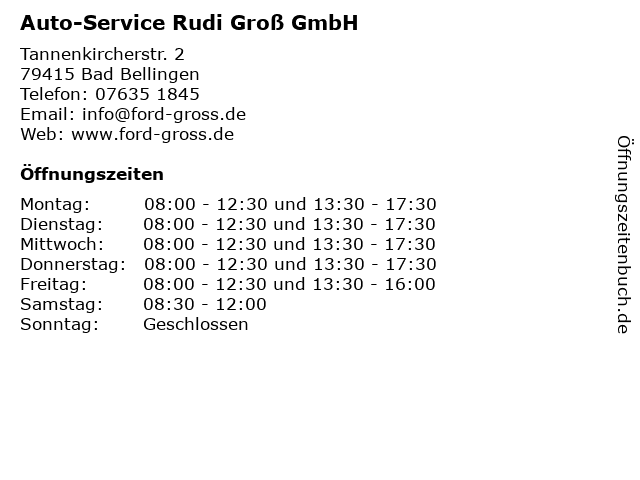 1 Auto-Service Rudi Groß GmbH - Werkstatt, Ersatzteile & Verkauf (Entfernung: 0,02 km) Tannenkirchener Str. 2a, 79415 Bad Bellingen 3 Hans-Rudi Lienin Schreinerei und Innenausbau (Entfernung: 10,75 km) Bläsiring 14, 79576 Weil am Rhein 6 |