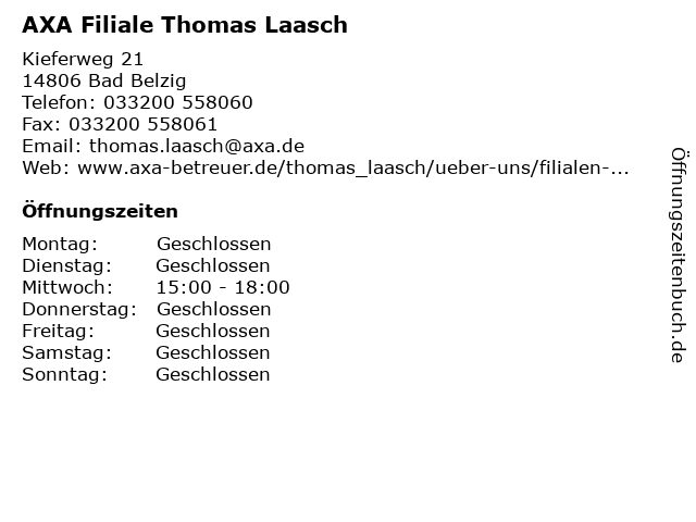 | Öffnungszeiten AXA Filiale Thomas Laasch in Bad Belzig anzeigen | |