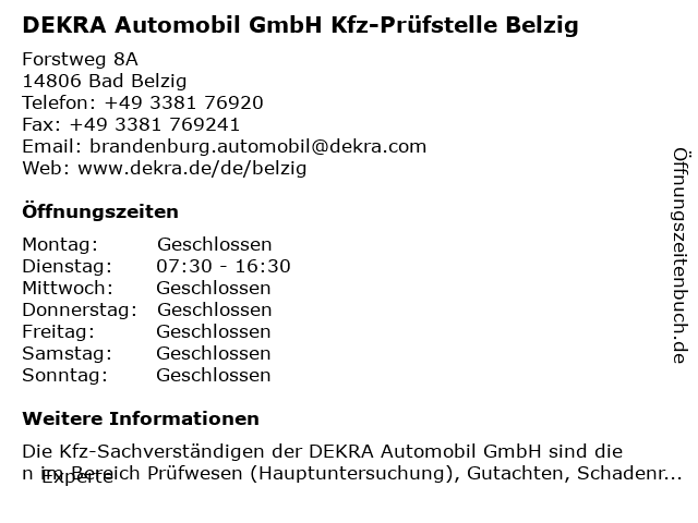 Branchen & Suchbegriffe zu DEKRA Automobil GmbH Kfz-Prüfstelle Belzig:abgasuntersuchung, au, auto-bewertung, automobil, baugutachter, dekra, fahrzeugbewertung, fahrzeugprüfung, gutachten, h-kennzeichen, hauptuntersuchung, hu, kfz, kfz-gutachter, kfz-prüfstelle, kfz-sachverständiger, oldtimer-gutachten, prüfstelle, schadengutachten, teilegutachten, tüv, unfallgutachten, wertgutachten auto, änderungsabnahmen |