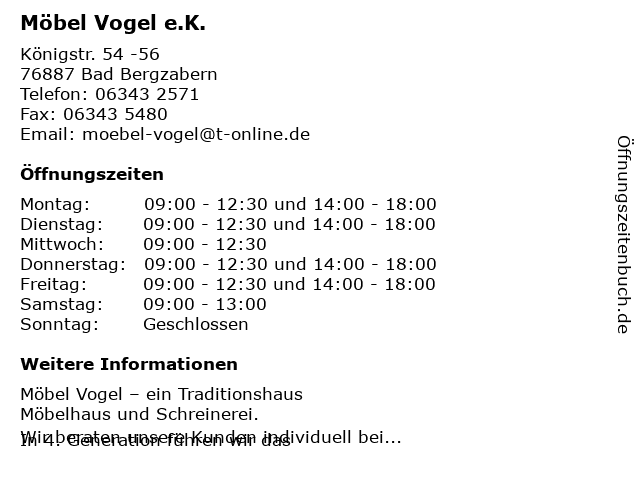 | Öffnungszeiten Möbel Vogel e.K. in Bad Bergzabern anzeigen | |