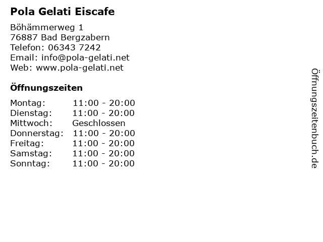 | Öffnungszeiten Pola Gelati Eiscafe in Bad Bergzabern anzeigen | |