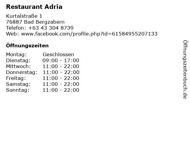 | Öffnungszeiten Restaurant Adria in Bad Bergzabern anzeigen | |