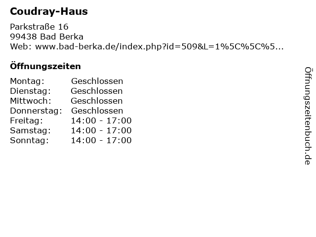 | Öffnungszeiten Coudray-Haus in Bad Berka anzeigen | |