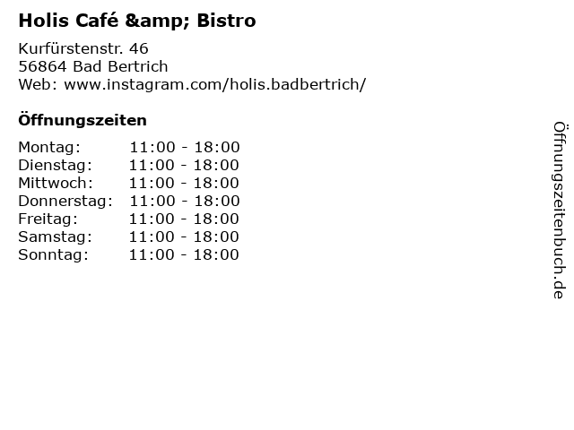 | Öffnungszeiten Holis Café & Bistro in Bad Bertrich anzeigen | |