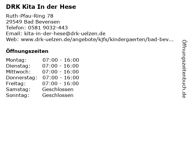 | Öffnungszeiten DRK Kita In der Hese in Bad Bevensen anzeigen | |