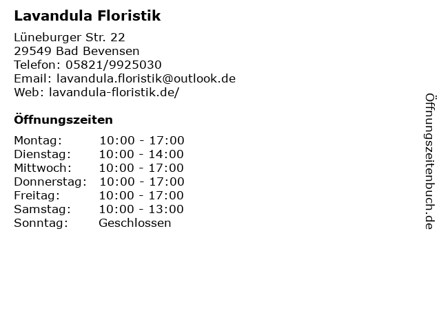 | Öffnungszeiten Lavandula Floristik in Bad Bevensen anzeigen | |