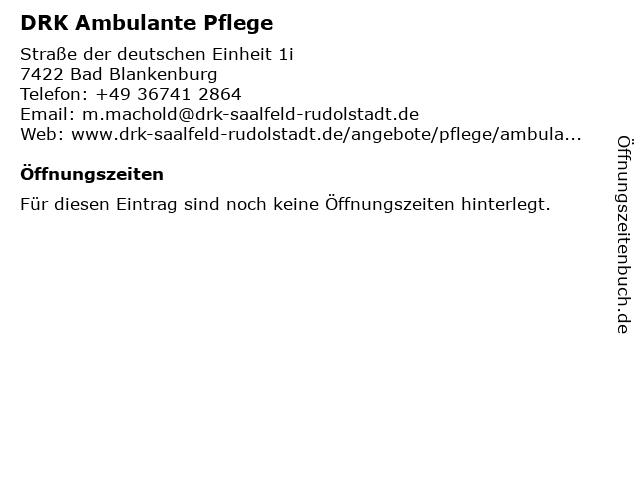 | Öffnungszeiten DRK Ambulante Pflege in Bad Blankenburg anzeigen | |
