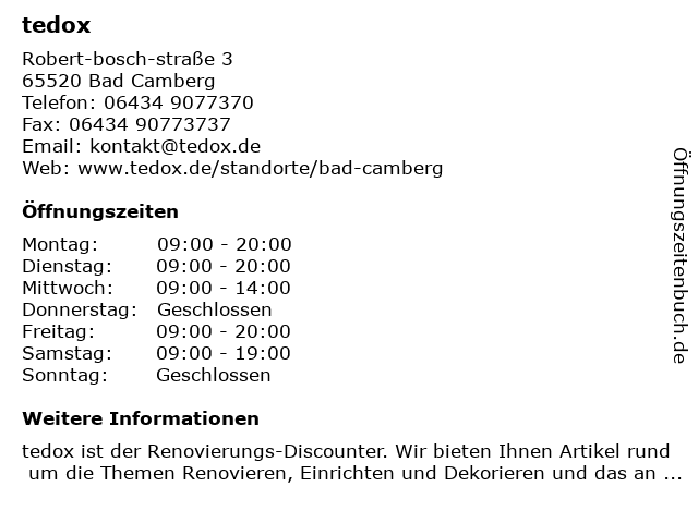 | Öffnungszeiten tedox in Bad Camberg anzeigen | |