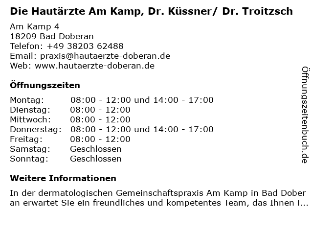 5 Dr. med. Annette Brosin - Privatpraxis Dermatologie (Entfernung: 13,99 km) Am Kringelgraben 35m, 18059 Rostock 6 Hausärztliche Gemeinschaftspraxis Chirotherapie | Tauchmedizin | Akupunktur (Entfernung: 15,68 km) Paulstraße 47, 18055 Rostock |