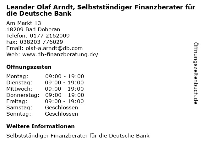 Branchen & Suchbegriffe zu Leander Olaf Arndt, Selbstständiger Finanzberater für die Deutsche Bank:arndt, bank, deutsche, finanzberater, leander, olaf, selbstständiger |