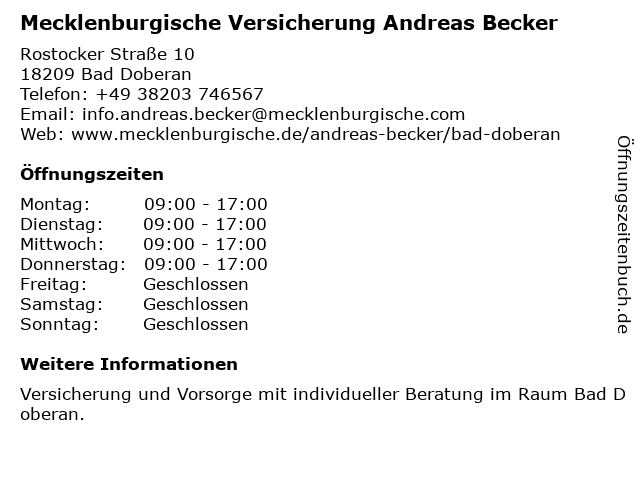 1 Mecklenburgische Versicherung Carl-Robert Kayatz (Entfernung: 0,01 km) Friedrich-Franz-Straße 1 a, 18209 Bad Doberan 2 Mecklenburgische Versicherung Andrea Lembke (Entfernung: 0,01 km) Rostocker Straße 10, 18209 Bad Doberan 6 Tourismuszentrum Mecklenburgische Ostseeküste (Entfernung: 8,07 km) Kühlungsborner Str. 2, 18236 Kröpelin |