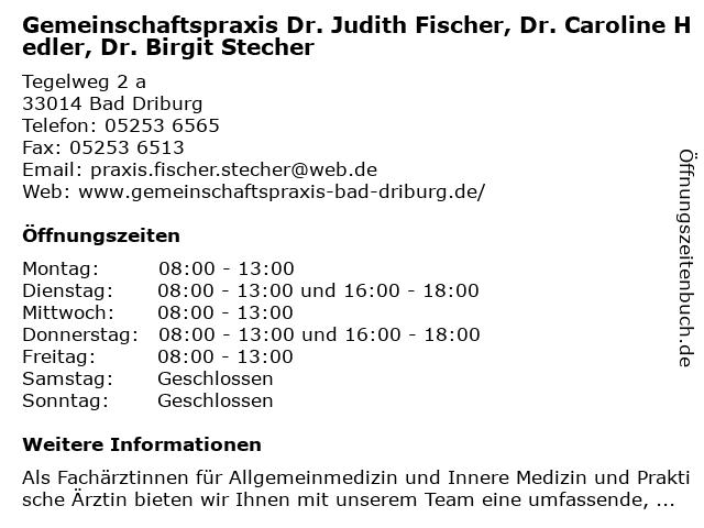 Branchen & Suchbegriffe zu Gemeinschaftspraxis Dr. Judith Fischer, Dr. Caroline Hedler, Dr. Birgit Stecher:birgit, caroline, dr., fischer, gemeinschaftspraxis, hedler, judith, stecher |