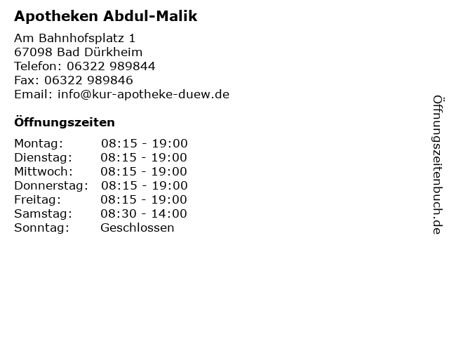 | Öffnungszeiten Apotheken Abdul-Malik in Bad Dürkheim anzeigen | |
