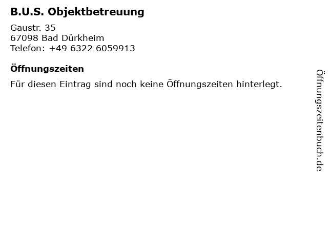 | Öffnungszeiten B.U.S. Objektbetreuung in Bad Dürkheim anzeigen | |