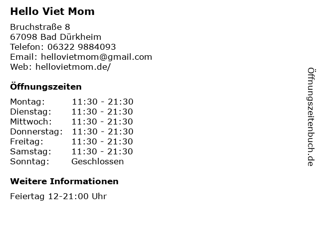 | Öffnungszeiten Hello Viet Mom in Bad Dürkheim anzeigen | |