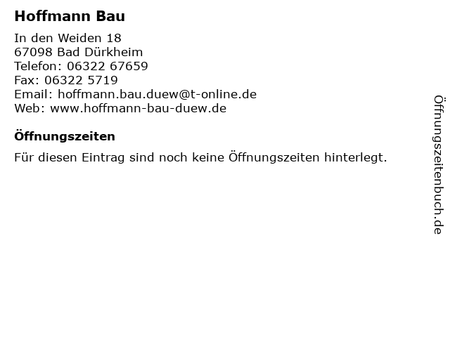 | Öffnungszeiten Hoffmann Bau in Bad Dürkheim anzeigen | |