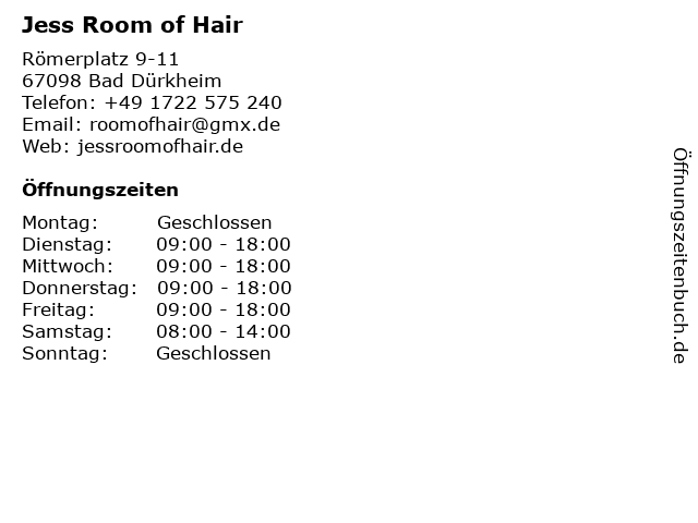| Öffnungszeiten Jess Room of Hair in Bad Dürkheim anzeigen | |
