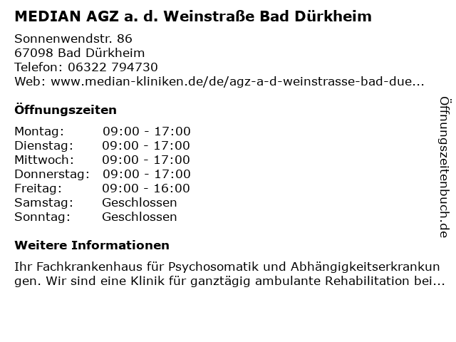 Branchen & Suchbegriffe zu MEDIAN AGZ a. d. Weinstraße Bad Dürkheim:a., agz, bad, beratungsstelle, d., kliniken, median, weinstraße |