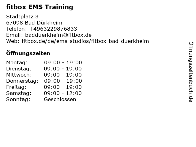 | Öffnungszeiten fitbox EMS Training in Bad Dürkheim anzeigen | |