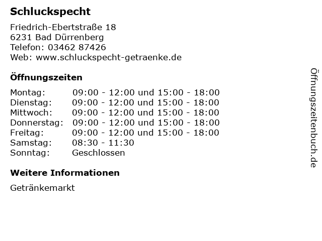 | Öffnungszeiten Schluckspecht in Bad Dürrenberg anzeigen | |