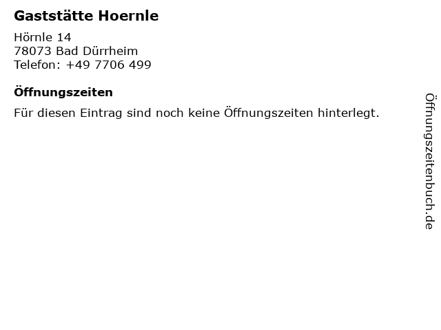 | Öffnungszeiten Gaststätte Hoernle in Bad Dürrheim anzeigen | |
