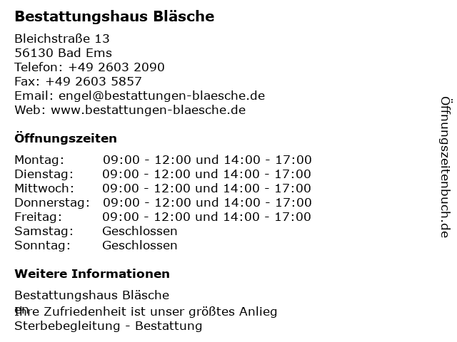 | Öffnungszeiten Bestattungshaus Bläsche in Bad Ems anzeigen | |