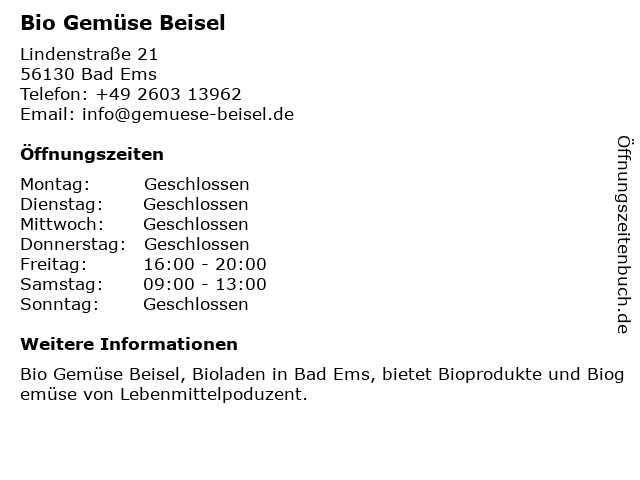 | Öffnungszeiten Bio Gemüse Beisel in Bad Ems anzeigen | |