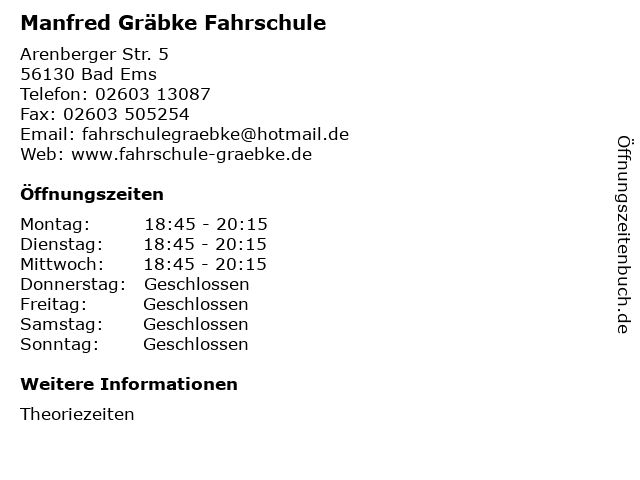 | Telefonnummer Manfred Gräbke Fahrschule in Bad Ems (02603 13087) anrufen | |