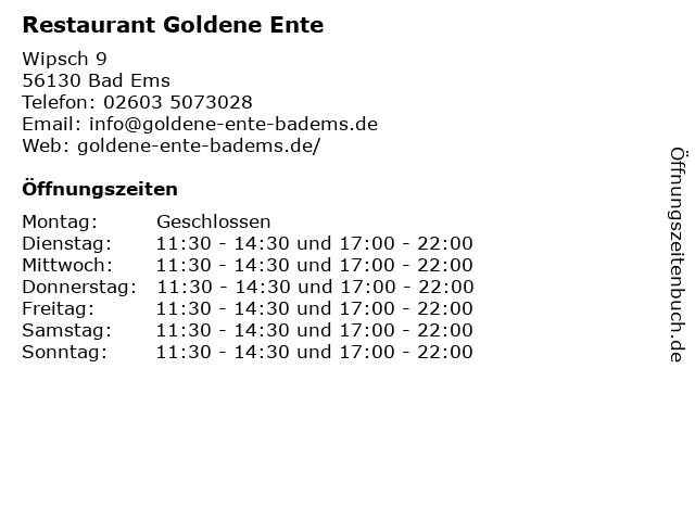 | Öffnungszeiten Restaurant Goldene Ente in Bad Ems anzeigen | |