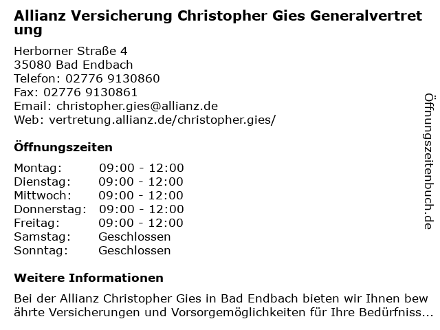 1 Allianz Versicherung Tim Janis Wagner Generalvertretung (Entfernung: 6,49 km) Bahnhofstraße 3, 35075 Gladenbach 2 Allianz Versicherung Robin Richter Generalvertretung (Entfernung: 10,64 km) Schelde-lahn-straße 58, 35688 Dillenburg 4 Allianz Generalvertretung - Thomas Schneeberger e.K. (Entfernung: 15,61 km) Hauptstr 113, 35745 Herborn 5 Allianz Versicherung Metz,Mandler und Brand GbR Generalvertretung (Entfernung: 15,61 km) Hauptstraße 113, 35745 Herborn 6 Allianz Versicherung Metz,Mandler,Kratz, Brand GbR Generalvertretung (Entfernung: 15,61 km) Hauptstraße 113, 35745 Herborn |