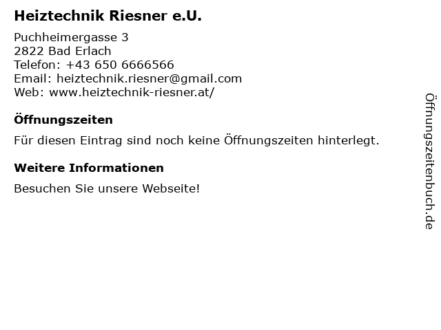 | Öffnungszeiten Heiztechnik Riesner e.U. in Bad Erlach anzeigen | |