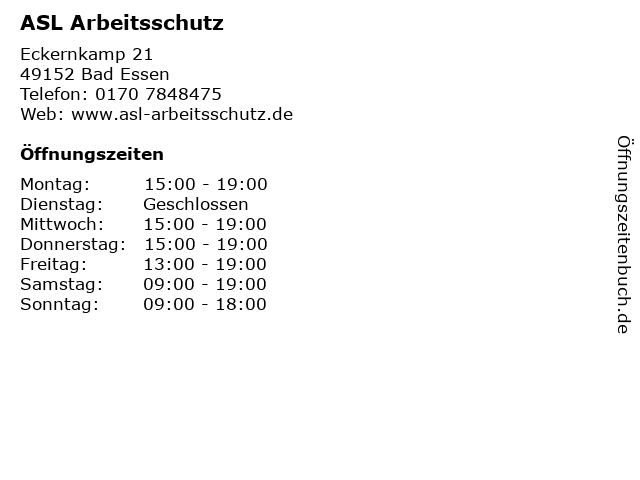 | Öffnungszeiten ASL Arbeitsschutz in Bad Essen anzeigen | |