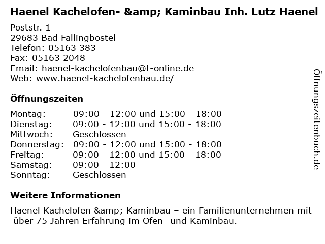 4 Thorsten Grünhagen Kachelofenu. Kaminbau Meisterbetrieb (Entfernung: 19,05 km) Am Brink 32, 27374 Visselhövede 6 Thoms Kaminhandel Import und Export GmbH und Thoms Schornsteinbau GmbH (Entfernung: 38,56 km) Hemelingsfeld 2, 30900 Wedemark |