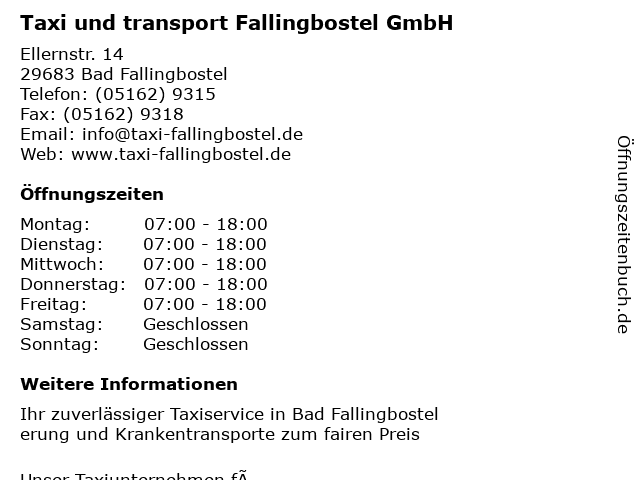 Branchen & Suchbegriffe zu Taxi und transport Fallingbostel GmbH:taxi, transport |