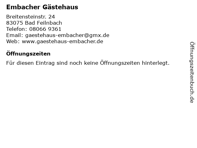 | Öffnungszeiten Embacher Gästehaus in Bad Feilnbach anzeigen | |