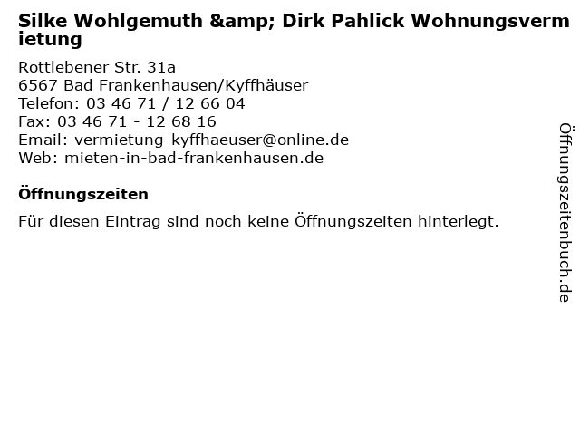 | Silke Wohlgemuth & Dirk Pahlick Wohnungsvermietung anrufen | |