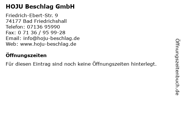 | Öffnungszeiten HOJU Beschlag GmbH in Bad Friedrichshall anzeigen | |
