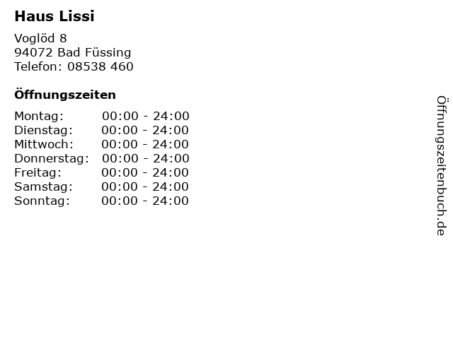| Öffnungszeiten Haus Lissi in Bad Füssing anzeigen | |
