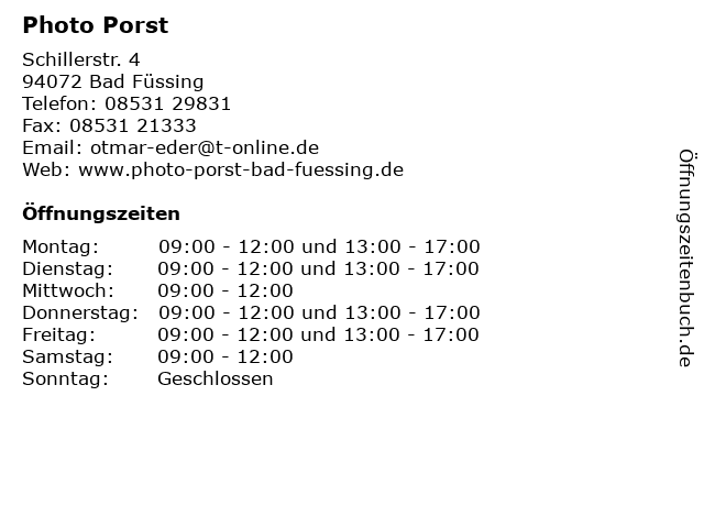 | Öffnungszeiten Photo Porst in Bad Füssing anzeigen | |