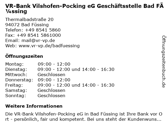 1 VR-Bank Passau eG, Geschäftsstelle Bad Füssing (Entfernung: 0,32 km) Sonnenstraße 4, 94072 Bad Füssing 6 |
