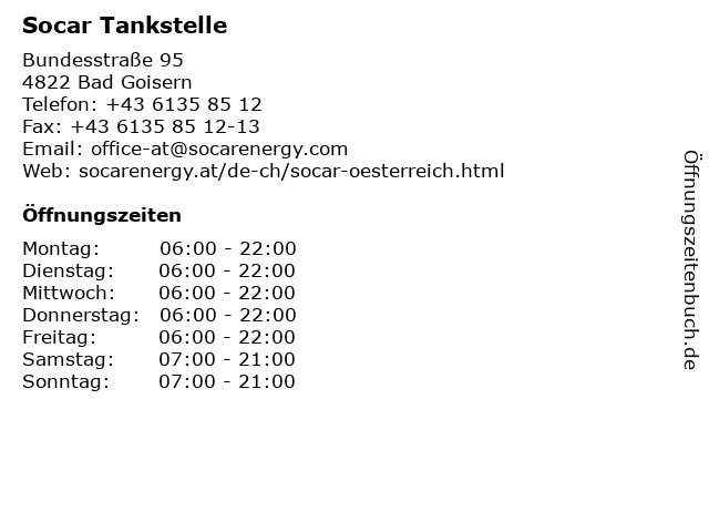 | Öffnungszeiten Socar Tankstelle in Bad Goisern anzeigen | |