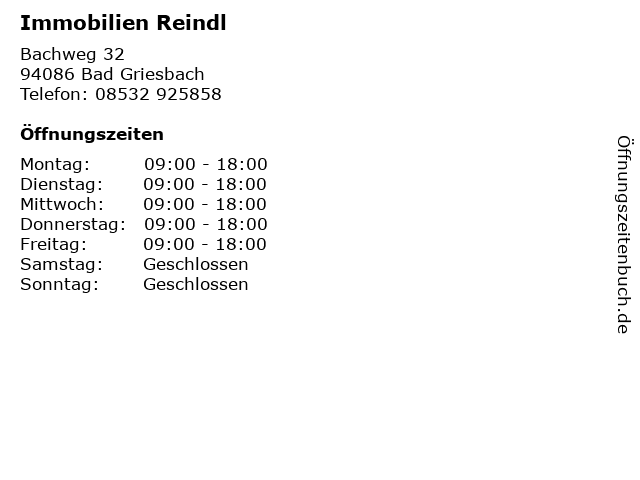 | Öffnungszeiten Immobilien Reindl in Bad Griesbach anzeigen | |